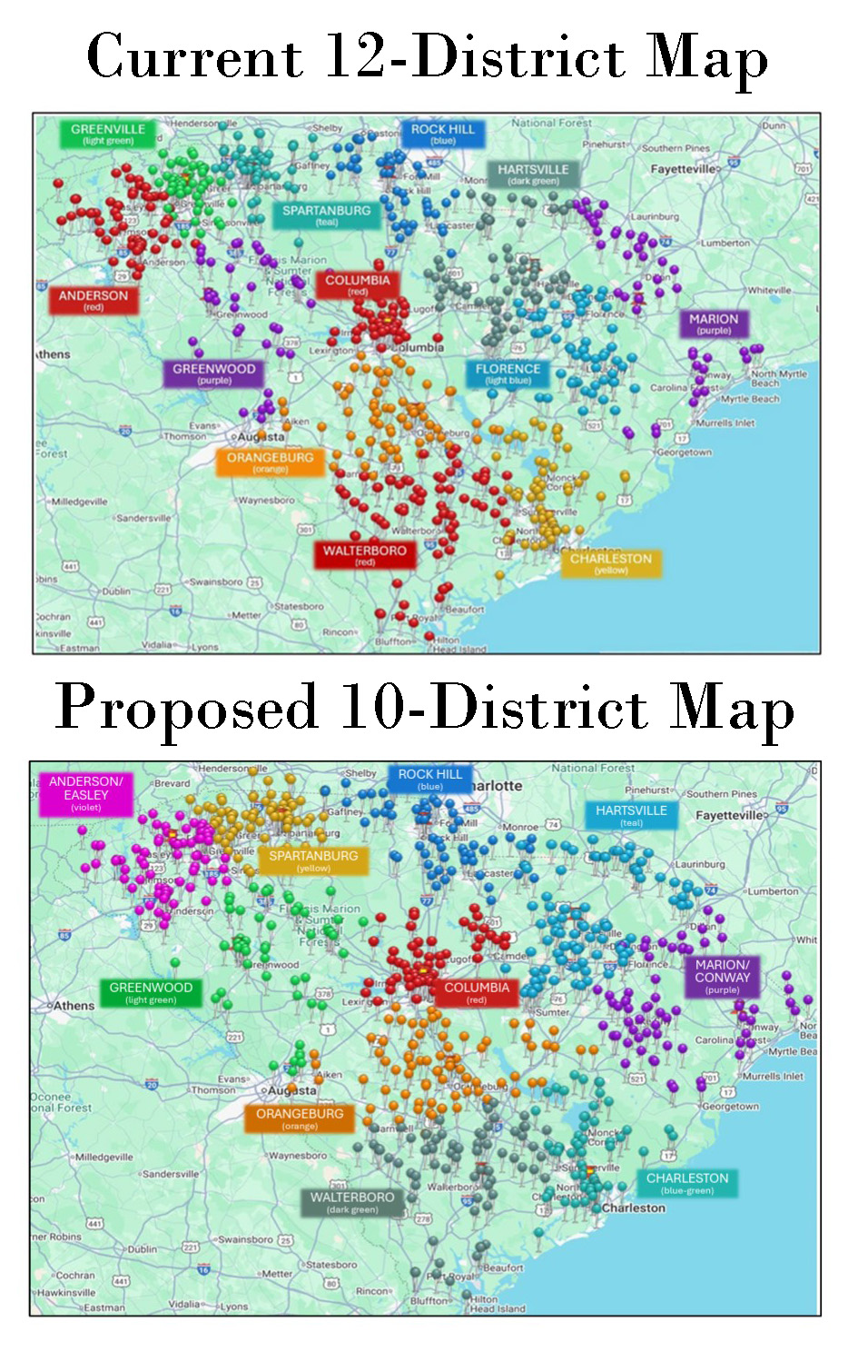 The proposed 10-District Option would merge the Florence District into the Hartsville and Marion districts by: